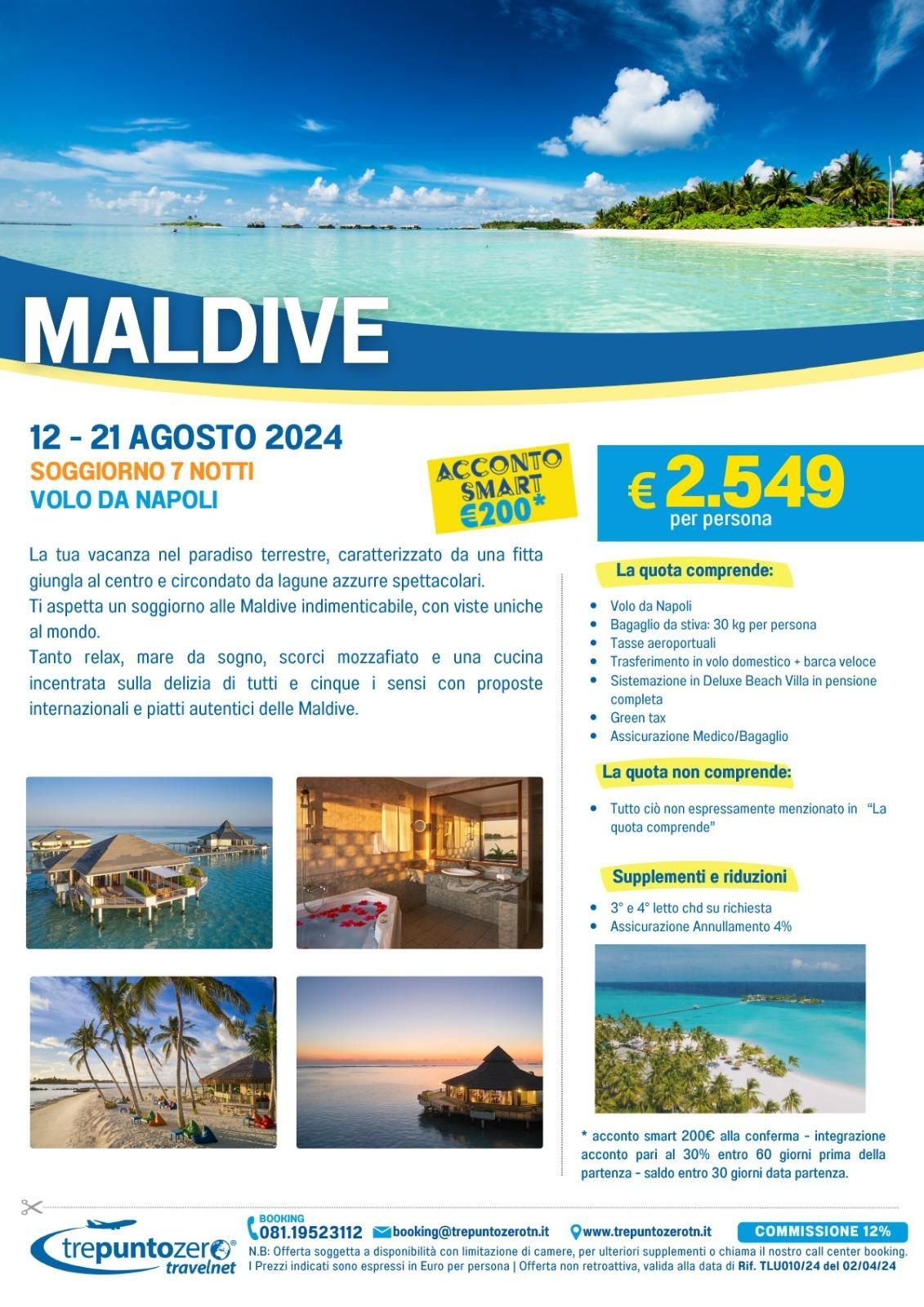 Parti con il volo diretto da Napoli per un'esperienza indimenticabile alle Maldive. Una volta atterrato, sarai accolto dalle acque cristalline, dalle spiagge di sabbia bianca e dalle palme ondeggianti che ti accompagneranno per tutta la durata del tuo soggiorno.